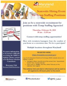 Statewide Virtual Hiring Event for Temp Staffing Positions on Thursday, February 18th from 10am-11:30am. Meet with recruiters/managers from the comfort of your home at a convenient time. No fee to participate! Register Here: https://mwejobs.maryland.gov/vosnet/Default.aspx