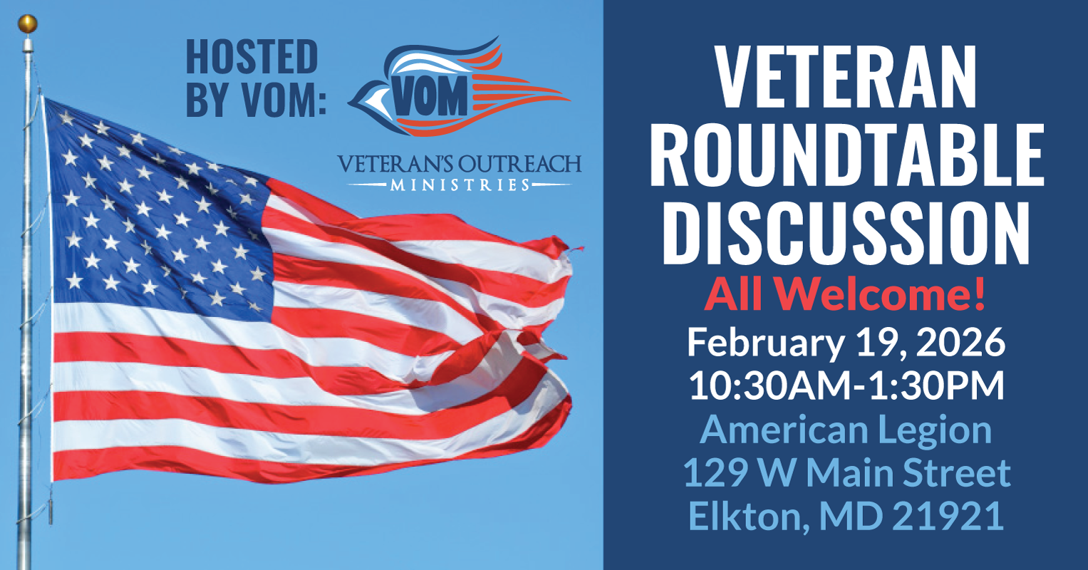 American Legion Post 15 - Elkton, MD ElktonConnect. Share. Support. The VOM Veterans Roundtable is an open discussion and networking opportunity for veterans and community supporters. Come share ideas, make connections, and be part of conversations that strengthen veterans and our local community. No speeches — just real conversation. On February 19, 2026, from 10:30am-1:30pm. Facebook Event listing: https://www.facebook.com/events/1149295593698403/ Location: American Legion,…