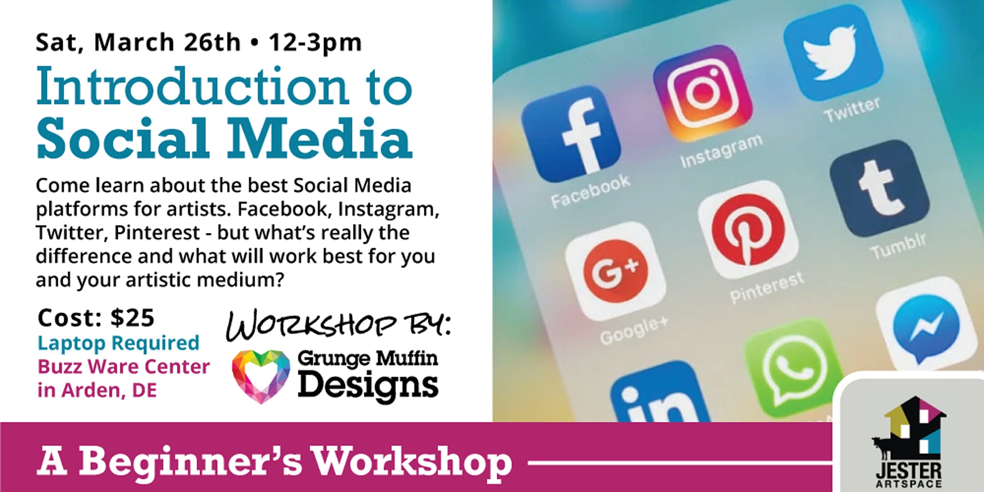 This is a workshop taught by our marketing team and resource partner Grunge Muffin Designs. This workshop is $25/person and is on SATURDAY, MARCH 26, 2022 AT 12 PM – 3 PM Learn about the best trending social media platforms for artists. You’ve probably heard of Instagram, Facebook, Twitter, and Pinterest, but what’s really the difference and what will work best for you and your artistic medium? Grunge Muffin Designs is going to walk through these popular selections and help you decide. Want to use all of them but don’t know where to start? We can help! Bringing your own...